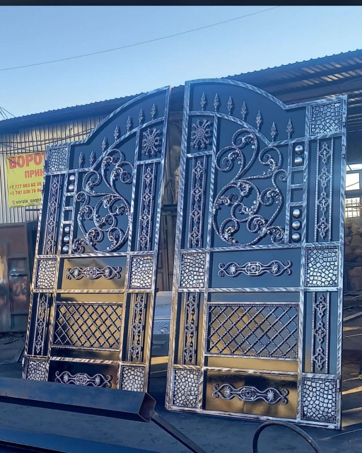 Метал ворота на заказ гаражные и въездные, ровные и витые, сложные и простые, несложные и кованые металлические ворота с замечательной ковкой оригинальной в мастерском исполнении дизайнерского подхода, дорогие и дешевые бюджетные, ровные и арочные, глухие с прозрачными смотровыми решетками, гаражные в гараж а дверью, автоматические въездные во двор с калиткой, с пиками, со столбиками. Купить просто с профлиста и кованые ворота откатные, распашные, подъемные, сдвижные. Можно выбрать металл 3 мм, 2 мм, 1,5 мм, каркас и профлист, цвета, замки, задвижки. Иллюстрация работ на фото строительного сайта 004.